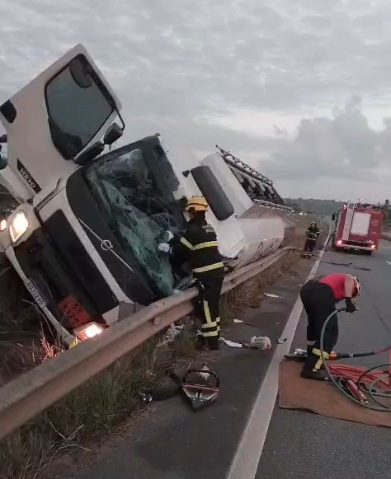 [Vídeo] Carreta tomba na BR-101 em Goianinha e motorista fica preso às ferragens